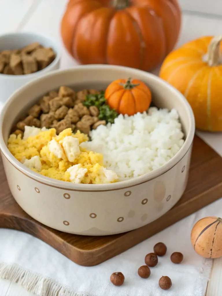 During recovery, keep it bland, simple, and safe. Cooked lean protein, soft carbs like white rice, and gentle additions like plain pumpkin or soft-boiled eggs work best.