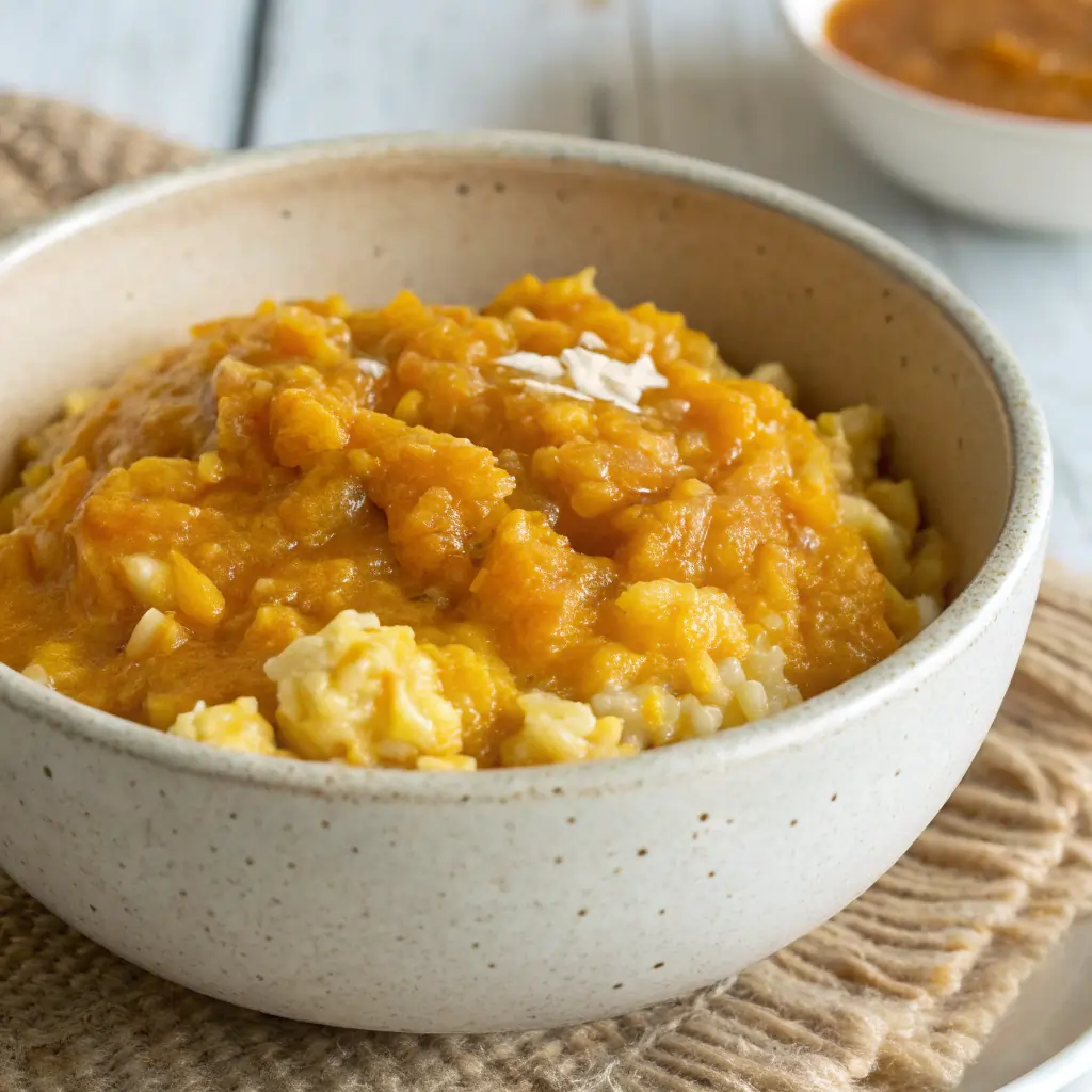 A classic recovery meal that also doubles as a lightweight, low-calorie canned-style option. Eggs provide digestible protein, while rice and pumpkin soothe the digestive system.