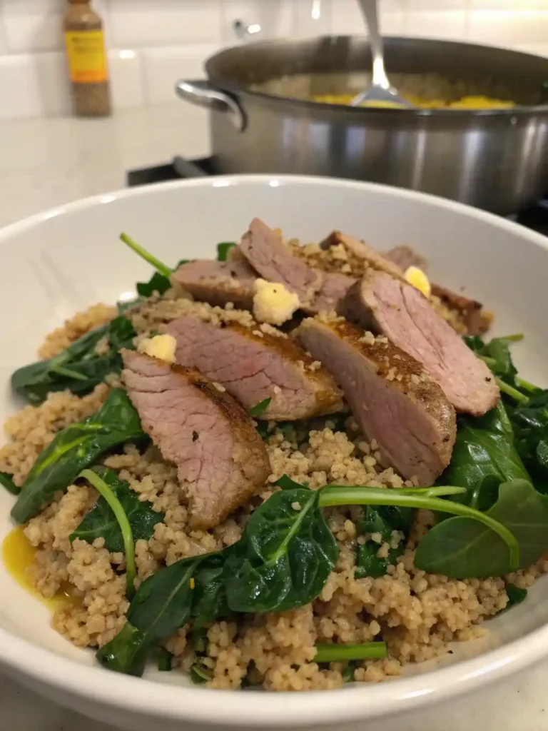 Why it works: Duck is a great protein for elimination diets. Quinoa and spinach round out the fiber and micronutrients while staying low-risk for allergies.
