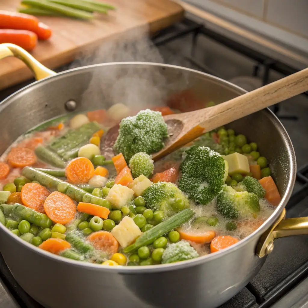 3. Add the frozen vegetables and stir them in. Continue simmering for another 5 minutes until veggies are tender but still vibrant.