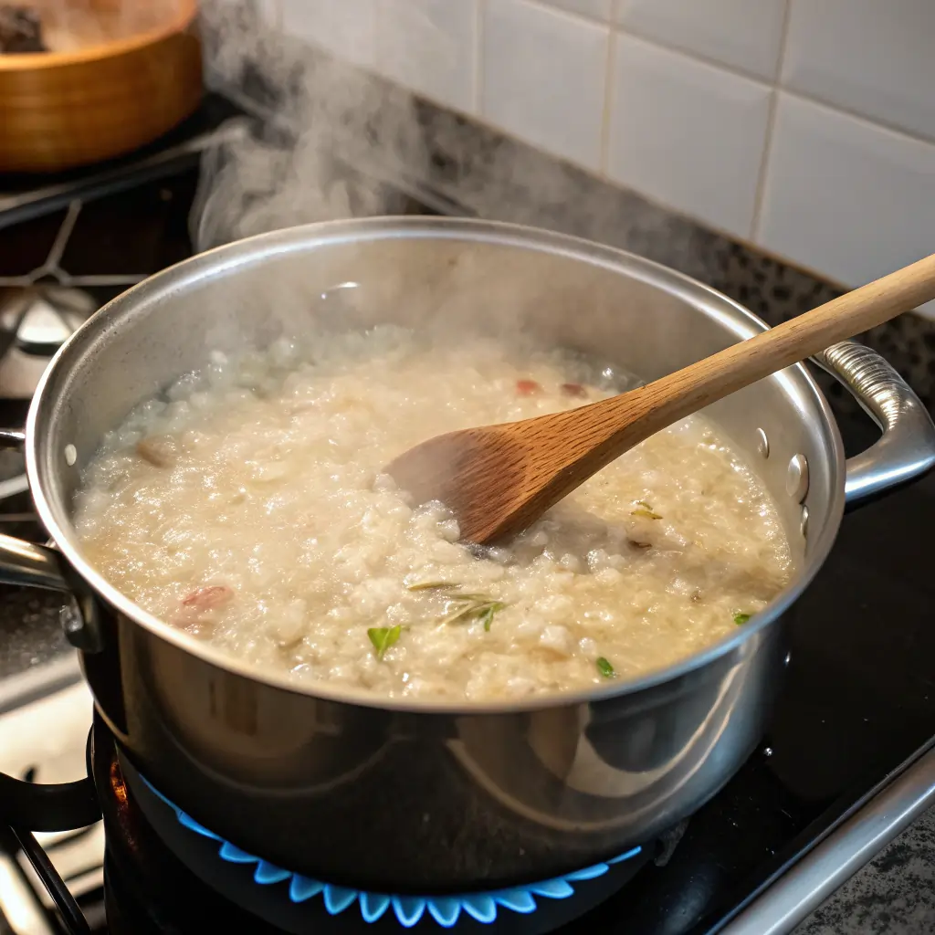 Once it’s bubbling, turn the heat down to low. Let it simmer gently for about 20 minutes. Stir now and then so the rice doesn’t stick.