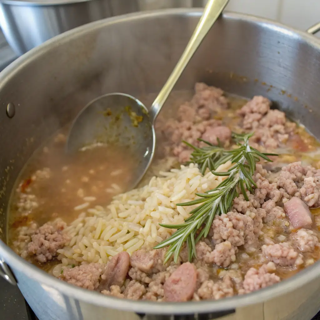 1. Start with a large pot or Dutch oven. Toss in the ground turkey, water or broth, brown rice, and rosemary. Use a spoon to break up the turkey for even cooking.